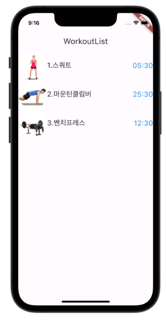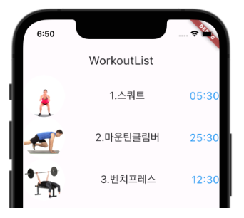 운동이름이 들어가는 Text widget을 Expanded로 wrap 하면 자연스럽게 이미지 영역과, 운동목표시간 Text영역을 제외한 전체 영역을 Expanded가 차지한다.